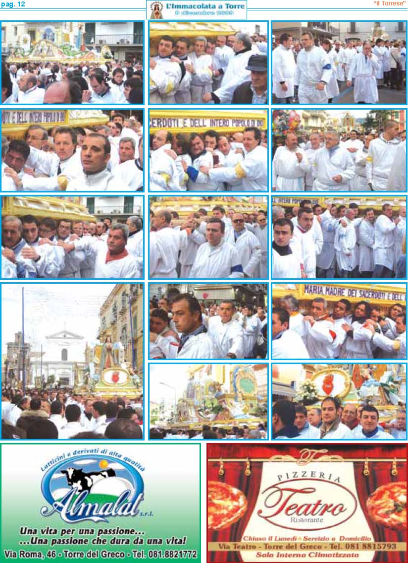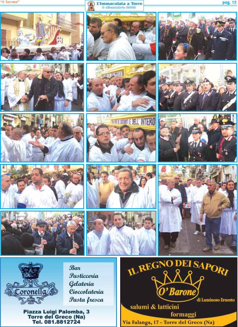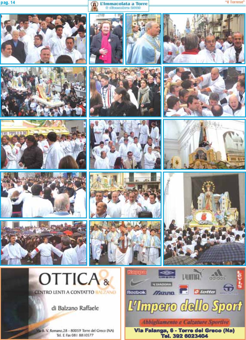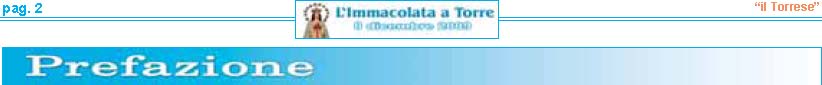 resentare la VI edizione dell'Immacolata a Torre è motivo di grande soddisfazione per me e per tutte lepersone che con fede e devozione ne curano la realizzazione. Sei anni di storia raccontati attraverso fotografie, pensieri teologici, emozioni e curiosità. Sei annidi lavoro apprezzati da tutti i nostri lettori. La chiave del successo? Innanzitutto l'umiltà delle persone che lavorano al progetto. Notizie semplici e scritte con il cuore. Un lavoro svolto con amore e fede, dedizione e passione, ma in particolare senza alcun scopo di lucro. Voglio ringraziare ancora una volta per la fiducia e l'interesse dimostrato il Settimanale “il Torrese" nella persona dell'editore nonché direttore responsabile Vincenzo Frulio unitamente al vicedirettore Maria Rosaria Picaro. Un ringraziamento particolare va al parroco della Basilica di Santa Croce don Giosuè Lombardo ed al viceparroco don Aniello Gargiulo per la disponibilità offertami, e a tutti i commercianti per aver affiancato l'iniziativa. Accolgo e ringrazio con entusiasmo il valido sostegno dell'Unione Cattolica Operaia SS. Assunta e del Comune di Torre del Greco nella persona del sindaco On. Ciro Borriello. La partecipazione da parte dell'Amministrazione Comunale è segno che questa festa oltre ad avere un valore religioso, racchiude anche un grande valore civile. Un grazie all'amico Luigi Ascione, grande devoto e mente storica sulla realizzazione del carro dell'Immacolata, per le notizie forniteci sulla ditta Sorrentino e per aver pubblicato tutti gli opuscoli dell'Immacolata a Torre sul portale web visitabile al sito www.immacolataditorre-delgreco.it. L'ultimo ringraziamento va ad una persona speciale. Sempre al mio fianco dalla prima edizione. Il suo impegno ha una valenza di dodici mesi all'anno. L'instancabile lavoro svolto è sicuramente la forza motrice della pubblicazione. Un grazie di cuore va per questo a Raimondo Mennella."A te o Maria sono dedicate queste umili pagine, affinché il tuo messaggio d'amore, la tua materna protezione, la tua devozione giunga nei cuori di tutti i lettori e di tutti i torresi che ricorrono a te quale Madre di grazia e di misericordia".
