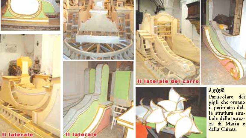 I FASE: Dal progetto stilato da Nicola Consiglio membro dall'Ucai di Torre del Greco, sotto la coordinazione di Giacomo Fiorentino, ed esposto nella Basilica diSanta Croce il 19 settembre con l'inizio delle celebrazioni dei dodici sabati della Madonna, l'esecuzione passa nelle mani dell'artista torrese Riccardo Lamberti.Legno intagliato e chiodi danno vita alla struttura portante. L'abile maestria del-l'artigiano torrese da alla costruzione votiva una prima immagine tridimensionale. Alla fine del mese di ottobre il carro si presente in un insolita veste, interamente in legno. II FASE: Dopo la realizzazione della struttura portante, carta, spilli e materiali effimeri la fanno da padrone. Sipassa alla rivestitura delle strutture lignee. Il carro viene nuovamente diviso in tante parti e con un lungo lavoro certosino si rivestono di carta, nastri e decorazioni tutte le strutture. III FASE: Una volta terminato il rivestimento dei singoli pezzi, il tutto viene riassemblato sulla struttura portante costituita da pali in legno castagno, intelaiati mediante funi di canapa, e vengono ultimate le rifiniture e la collocazione dei quadri e dei bassorilievi. Tutto deve essere pronto per il giorno 7 dicembre quando il carro, alle ore14, viene spostato dalla navata di destra a quella centrale della Basilica di Santa Croce.