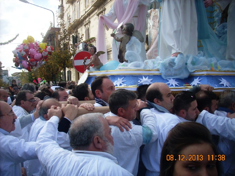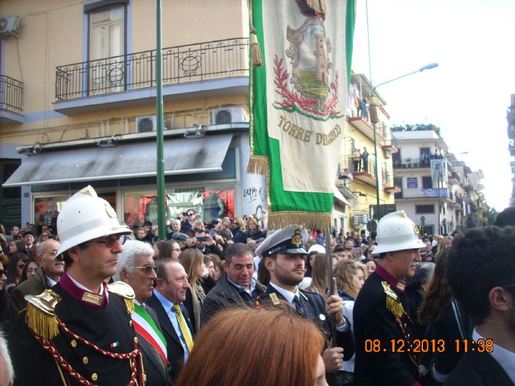 L’IMMACOLATA RIABBRACCIA I SUOI FIGLI DI TORRE DEL GRECO Quest’anno rispetto all’anno scorso il tempo è stato clemente,con un cielo sereno e assolato,che ha portato a Torre del Greco piu’ di 50.000 presenze per strada,da aggiungere ai 12.000 collegati in streaming su internet per la diretta della processione.Moltissima gente si è riversata in strada sin dal mattino per accogliere la solenne processione, tra residenti ed emigrati tornati nella città corallina per onorare il Carro Trionfale dell’Immacolata Concezione. Il Carro recante la prodigiosa statua dell’Immacolata è dedicato quest’anno al Beato Vincenzo Romano,nel 50°anniversario dalla canonizzazione.il carro trionfale è uscito dalla Basilica in una piazza gremita di gente alle 10:15 circa, in ricordo della prima scossa tellurica dell’8 dicembre del 1861.Una Piazza Santa Croce e tutte le vie di accesso affollate fino all’inverosimile da migliaia di torresi. Il carro si è fermato qualche minuto all’ingresso della Chiesa quando, al primo suono dell’antica campanella d’argento, la statua della Madonna è stata innalzata per dare il primo saluto alla popolazione in un immenso abbraccio tra la Madre e i suoi figli di Torre del Greco. Nello stesso istante un volo di decine di colombe bianche, in un applauso fragoroso dei presenti, ha avuto inizio la processione con la delicata discesa del carro lungo le scalinate ripide di Santa Croce. Come ogni anno, questo il momento più emozionante: tra persone in lacrime, preghiere, braccia al cielo e il suono melodioso di campane misto a quello dei fuochi d’artificio. Il Carro era preceduto dalla Banda «Associazione musicale culturale torrese», composta da 30 elementi, dalla Congrega della S.S. Assunta, dal Preposito curato Don Giosuè Lombardo,dal vice Parroco Don Domenico Panariello e da alcuni sacerdoti locali, dagli stemmi della Basilica, e seguito dal Sindaco con le autorità e il gonfalone della città, da una serie di piccoli carri in miniatura realizzati e portati a spalla dai ragazzi delle varie Parrocchie cittadine e dei vari comitati ,tra cui anche quello del gruppo femminile,portato a spalla da solo donne ,in questo lungo corteo popolare il carro ha cominciato la sua processione. Dopo via Salvator Noto ,si è giunti a via Roma,via Vittorio Veneto,per poi proseguire per la I Traversa e imboccare via Avezzana fino alla Piazza Martiri d’Africa,poi per via Guglielmo Marconi e svoltare per via Circonvallazione,dove davanti alla caserma dei Carabinieri c’è stato un omaggio all’Immacolata,scandito dalle note dell’inno di Mameli,cantato dai numerosi presenti.Si è proseguiti per Corso Vittorio Emanuele,per via Diego Colamarino,fino a Largo Santissimo ,per poi ritornare in Piazza Santa Croce.Sono le 12:55 quando il Carro inizia a scendere per via Comizi,fino alla fermata storica in Largo Santa Maria di Costantinopoli,da qui per la via Rampa Comizi e in via Fontana,dove sosta anche in via Liberta’.Si prosegue per via Colonnello Pica ,via Monsignor Felice Romano,via Cesare Battisti e via Calastro,qui davanti alla nuova sede della Capitaneria di Porto e al distaccamento dei Vigili del Fuoco altro omaggio all’Immacolata da parte dei militari della Marina con tradizionale suono della sirena portuale. Si arriva sulla Spiaggia del fronte ,dove l’Immacolata sul Porto rende omaggio a tutti gli uomini del mare.Si prosegue per Corso Garibaldi,sotto al ponte ferrovario di Largo Gabella del Pesce ,Strada Agostinella,via XX Settembre,qui come ogni anno ha luogo il tradizionale volo dei colombi bianchi.Si giunge in Piazza Luigi Palomba all’altezza della Chiesa del Carmine,dopo la fermata obbligatoria all’incrocio con via Gaetano de Bottis ,si percorre Corso Umberto I ,via Beato Vincenzo Romano e dopo aver sostato all’incrocio con via Falanga,si arriva in Piazza Santa Croce alle 16:20.Qui l’Immacolata viene innalzata sul suo carro trionfale per salutare i suoi figli di Torre del Greco,mentre il Parroco Don Giosue’ Lombardo,raccoglie tutti i presenti in preghiera e impartisce la solenne benedizione a tutti. Il Carro durante il suo percorso, come ogni anno, è stato salutato da tantissima folla esultante, dai balconi decorati con antiche coperte pregiate e lancio di bigliettini colorati con preghiere per la Madonna, da fuochi d’artificio e da omaggi floreali, e dopo un giro di circa 6 ore, alle 16:35 circa il carro trionfale dell’Immacolata è rientrato in Basilica. È il momento del saluto, dell’arrivederci, dell’ultima preghiera, dell’ultima lacrima…W Maria.Grazie a tutti in nome di Maria,L’Immacolata Concezione. Ascione Luigi