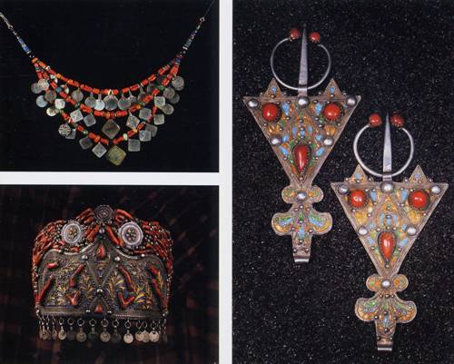 in corallo, ambra, amazzonite, paste vitree, pendenti in argento.
