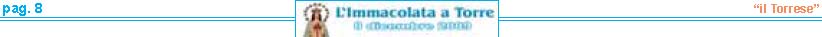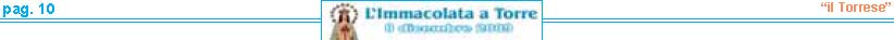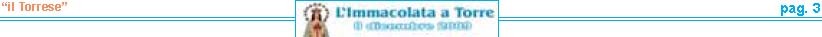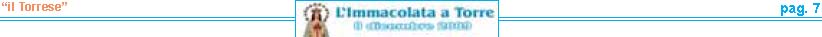 resentare la VI edizione dell'Immacolata a Torre è motivo di grande soddisfazione per me e per tutte lepersone che con fede e devozione ne curano la realizzazione. Sei anni di storia raccontati attraverso fotografie, pensieri teologici, emozioni e curiosità. Sei annidi lavoro apprezzati da tutti i nostri lettori. La chiave del successo? Innanzitutto l'umiltà delle persone che lavorano al progetto. Notizie semplici e scritte con il cuore. Un lavoro svolto con amore e fede, dedizione e passione, ma in particolare senza alcun scopo di lucro. Voglio ringraziare ancora una volta per la fiducia e l'interesse dimostrato il Settimanale “il Torrese" nella persona dell'editore nonché direttore responsabile Vincenzo Frulio unitamente al vicedirettore Maria Rosaria Picaro. Un ringraziamento particolare va al parroco della Basilica di Santa Croce don Giosuè Lombardo ed al viceparroco don Aniello Gargiulo per la disponibilità offertami, e a tutti i commercianti per aver affiancato l'iniziativa. Accolgo e ringrazio con entusiasmo il valido sostegno dell'Unione Cattolica Operaia SS. Assunta e del Comune di Torre del Greco nella persona del sindaco On. Ciro Borriello. La partecipazione da parte dell'Amministrazione Comunale è segno che questa festa oltre ad avere un valore religioso, racchiude anche un grande valore civile. Un grazie all'amico Luigi Ascione, grande devoto e mente storica sulla realizzazione del carro dell'Immacolata, per le notizie forniteci sulla ditta Sorrentino e per aver pubblicato tutti gli opuscoli dell'Immacolata a Torre sul portale web visitabile al sito www.immacolataditorre-delgreco.it. L'ultimo ringraziamento va ad una persona speciale. Sempre al mio fianco dalla prima edizione. Il suo impegno ha una valenza di dodici mesi all'anno. L'instancabile lavoro svolto è sicuramente la forza motrice della pubblicazione. Un grazie di cuore va per questo a Raimondo Mennella."A te o Maria sono dedicate queste umili pagine, affinché il tuo messaggio d'amore, la tua materna protezione, la tua devozione giunga nei cuori di tutti i lettori e di tutti i torresi che ricorrono a te quale Madre di grazia e di misericordia".