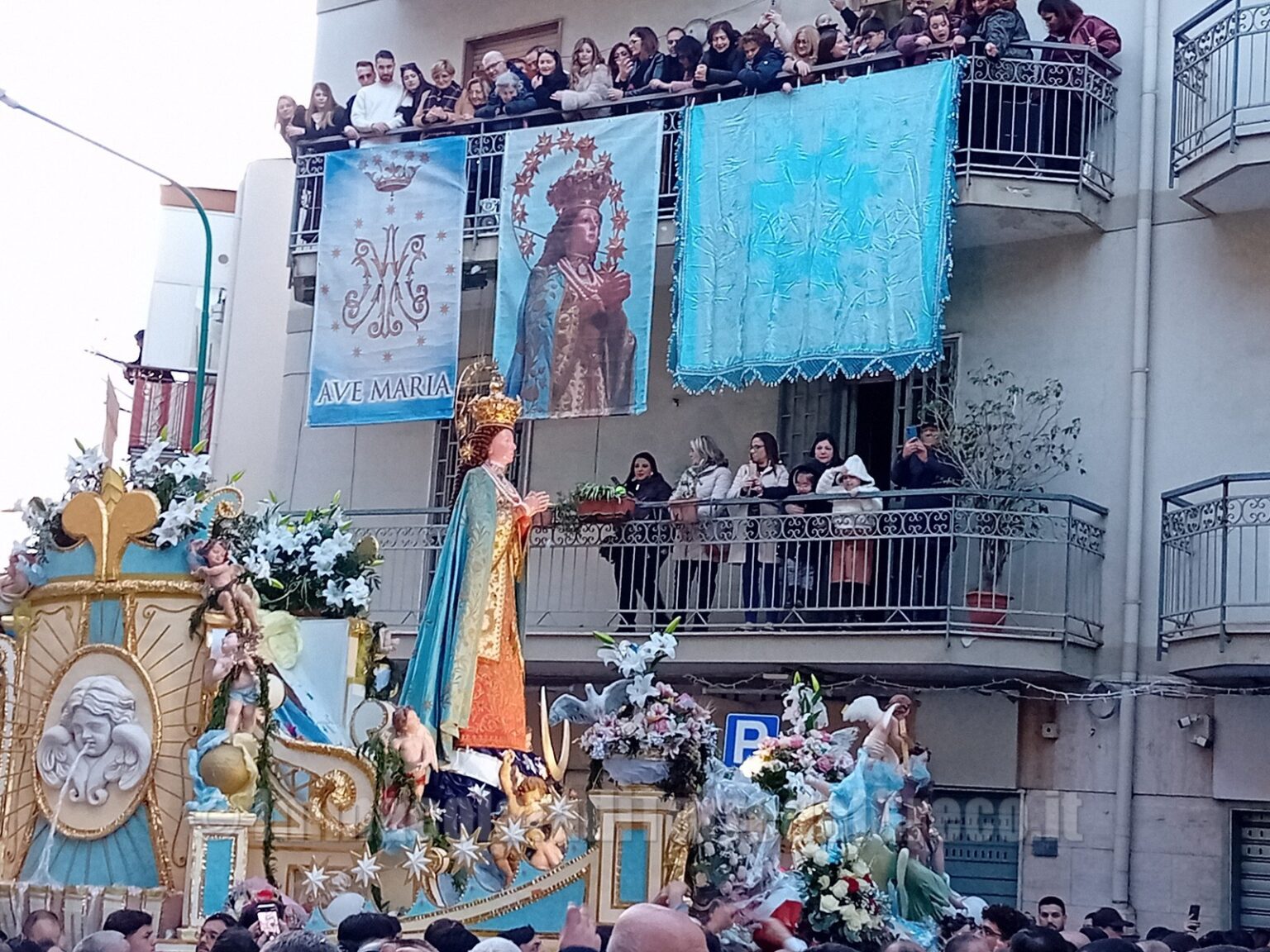 Episodi, Aneddoti e Curiosita’ della festa dell’Immacolata a Torre del Greco La storia del carro votivo dell’Immacolata a Torre del Greco è ricca di episodi ,aneddoti e curiosita’ verso colei che, da secoli, è la sua patrona,l’Immacolata Concezione. Tutti questi avvenimenti sono una sorta di memoria storica da tramandare ai posteri, che, contribuiscono a scrivere, anno dopo anno, la straordinaria pagina di devozione mariana del popolo torrese. Iniziamo allora dall’inizio,dal 1862 a meta’ del “900”,in cui l’8 dicembre,giorno della festivita’ della SS.Immacolata,quando il tempo non era clemente col popolo torrese ,la processione veniva rimandata alla festivita’ successiva.Ma a volte anche nei giorni fissati per la processione,le condizioni meteo erano avverse,per cui si decideva che il primo giorno anche feriale e lavorativo di condizioni meteo ottimali, il Carro trionfale con l’Immacolata sarebbe stato portato in processione.A quel tempo erano i carpentieri e i marinai del porto a portare il carro in giro per le vie cittadine,cosi appena vi era l’occasione di avere una giornata di bel tempo,venivano chiamati in mattinata i carpentieri e i marinai dal porto per effettuare la processione dell’Immacolata. L’8 dicembre 1943 si era in piena seconda guerra mondiale ,ed erano trascorsi pochi mesi da quando il 1 ottobre 1943 gli americani entrano in una Napoli già liberata. Torre del Greco ormai liberata dai fascisti e dai tedeschi , aveva ancora negli occhi quel 13 settembre in cui questi stessi Alleati, per fermare una colonna tedesca lungo Corso Vittorio Emanuele, sganciarono 200 bombe su Torre del Greco. Come si sa fu distrutto l’Ospedale Maresca e le chiese di Santa Maria del Popolo e della Congrega di San Giovanni Battista, mai più ricostruita.Anche gli edifici religiosi delle suore di Santa Geltrude furono colpiti e l’altare lesionato.Ma la guerra non fermo’ la devozione dei torresi verso l’Immacolata ,che fu portata in processione l’8 dicembre,in una Torre del Greco devastata dai bombardamenti, su di un piccolo carro trionfale.Domenica 8 dicembre 1957, festivita’ dell’Immacolata, il cattivo tempo non permise alla processione del carro trionfale dell’Immacolata di uscire e il tutto fu rinviato a domenica 15,in cui il carro trionfale andò in processione.Il 26 Dicembre 1959 si è creato uno dei due precedenti della storia secolare dell’Immacolata,infatti all’epoca la festivita’ dell’Immacolata ricorreva martedi 8 dicembre ma per tempo cattivo fu rimandata alla domenica successiva 13,ma in quel giorno ci furono ancora condizioni meteologiche avverse e fu rimandata alla domenica 20,ma niente da fare anche in quel giorno il tempo non fu clemente cosi fu’ tutto rimandato il sabato 26 Santo Stefano in cui finalmente il Carro trionfale ando’ in processione.Il 1964, l’8 dicembre era di martedi ma le condizioni meteo non permisero la processione del carro trionfale dell’Immacolata che fù rinviata a domenica 13 dicembre ,ma anche in questo giorno il tempo non fù clemente su Torre del Greco ,così si decise di rimandare a domenica 20 dicembre ,in cui finalmente il carro trionfale andò in processione.Nel 1965 come nel 1959 ,l’8 dicembre e le successive domeniche (ndr il 12 e il 19)le condizioni meteo non permisero l’uscita in processione del carro trionfale dell’Immacolata,quindi fù rinviata a domenica 26 dicembre Santo Stefano,in cui il carro trionfale finalmente uscì in processione.Il lungo corteo preceduto dalla congrega di San Michele e da due fila di bambine vestite di bianco ed il capo cinto da una coroncina di fiori, aveva appena lasciato Piazza Santa Croce imboccando via Salvator Noto.Quando il carro trionfale dell’Immacolata ,percorrendo qualche decina di metri piu sù della chiesa di San Filippo ,un filo di ferro steso a meno di 5 metri d’altezza che sorreggeva una luminaria natalizia, tolse la corona insieme allo stellato dal capo della Vergine,e ogni tentativo di sistemarla andò a vuoto.L’immensa folla che affollava via S. Noto e piazza Santa Croce, passò dalla gioia al silenzio tombale.Sul volto della gente incredula e quasi spaventata, affioravano le lacrime, mentre la notizia si diffondeva per tutta la città.Subito il popolo torrese, penso’ che l’accaduto fosse un cattivo presagio per la città,ma non fu cosi. Si decise allora che il carro trionfale con l’Immacolata anche senza corona e stellato continuasse la processione per le vie di Torre del Greco.Nel 1966,l’8 dicembre era di giovedi ,ma per condizioni meteo avverse la processione del carro trionfale fù rinviata prima a domenica 11 e poi a domenica 18,in cui finalmente il carro trionfale uscì in processione.Dal 1862 fino al 1972 dopo la girata del giorno 7 dicembre ,il carro trionfale è stato sempre posizionato nella navata centrale sotto la cupola sul lato destro .Ma nel 1973 un incendio si sviluppo’ sull’altare maggiore della Basilica di Santa Croce,danneggiando non poco l’altare.Per questo motivo il parroco di allora Don Rocco Borriello fece costruire proprio al centro della chiesa sotto la cupola,un nuovo altare,sopra una pedana di marmo marrone scuro con due gradini. ( con la ristrutturazione della Basilica per il Giubileo del 2000 fu finalmente rimosso) Infatti dal 1973 con questo nuovo altare non fù piu’ possibile posizionare il carro trionfale dove è stato in esposizione per 111 anni, ma fù posizionato dove lo vediamo oggi ,cioè proprio sotto al pulpito.Dal 1973 al 1999 ,per 27 anni si è dovuto assistere ad una girata del carro trionfale con una manovra molto difficile,in quanto prima del 1973 i portatori doveva solo far uscire il carro dalla navata di destra e posizionarlo al centro della chiesa,ma con l’avvento del nuovo altare si è complicata la manovra ,diventando molto difficile e pericolosa per i portatori.In quanto oltre che ad uscire il carro al millimetro dalla navata di destra,si doveva salire due scal