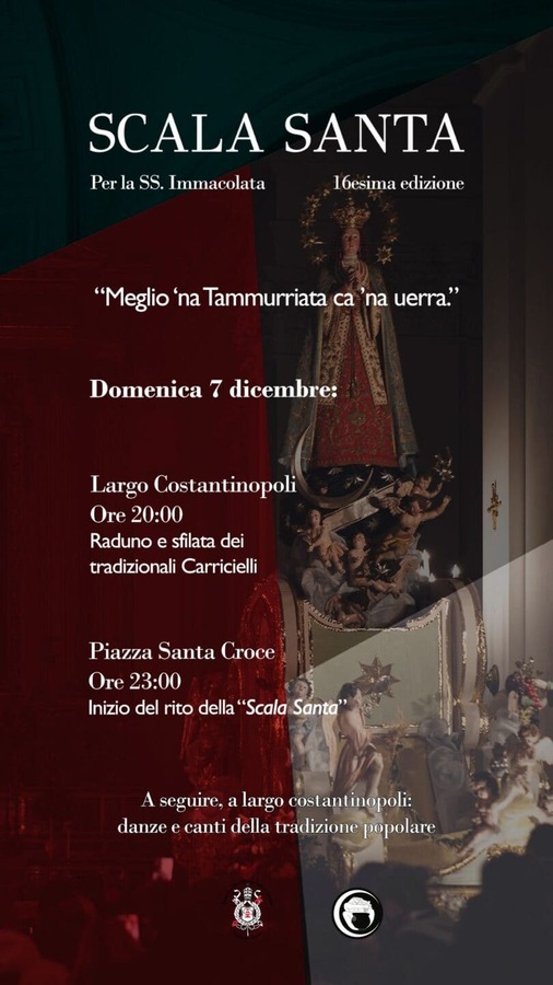 Domenica 7 dicembre 2025 Scala Santa per l’Immacolata di Torre del Greco Scala Santa per l’Immacolata di Torre del Greco (Napoli) 7 dicembre 2025 – 16° edizione Ore 20:00 – Largo Costantinopoli Raduno dei tradizionali “carricielli” (opere progettate e construite dai ragazzi dei quartieri, delle scuole e degli oratori) A seguire sfilata per le vie del centro storico con suoni della tradizione . Ore 23:00 – Piazza S.Croce inizio del rito tradizionale della Scala Santa.A cura dei Luna Janara “Ringraziamo anticipatamente tutti voi che parteciperete a questo rito spontaneo e no profit, mossi dalla passione per le tradizioni, dall’amicizia, dall’amore che ci lega all’Immacolata e alla nostra città”.Toto Toralbo. |