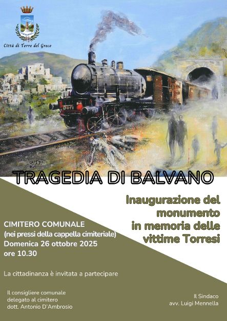 Luigi Mennella sindaco: posto al cimitero il monumento in memoria delle vittime di Balvano Nella tragedia morirono quasi seicento persone: trenta erano cittadini di Torre del Greco “In memoria dei nostri concittadini defunti nel tragico disastro ferroviario avvenuto in Balvano il 3 marzo 1944”: è la scritta che campeggia sul monumento a forma di binario posto all’interno del cimitero di Torre del Greco e che ricorderà le vittime torresi di una della più immani tragedie ferroviarie della storia nazionale, quella del 3 marzo 1944 nella quale morirono quasi seicento persone. Di queste, trenta erano appunto di Torre del Greco: si tratta di Antonio Accardo, Rosario Amato, Giacomo Amitrano, Giovanni Ascione, Luigi Ascione, Agostino Avventurato, Vincenzo Avventurato, Luigi Balzano, Edmondo Betti, Giulietta Brancaccio, Mariateresa Castaldo, Carmela D’Aniello, Francesco Paolo De Luca; Domenico Di Cristo, Armando Di Somma, Enrico Esposito, Antonio Formisano, Tommaso Giocondo, Carmine Izzo, Antonio Luna, Gennaro Organista, Aniello Paduano, Vincenzo Pernice, Arturo Pierini, Natale Pinto, Gerardo Pontillo, Armando Somma, Antonio Tammaro, Giuseppe Velardo e Giuseppe Versante.Il monumento è stato scoperto ieri, domenica 26 ottobre, nell’area del cimitero posto a ridosso della scale che portano alla chiesa madre, luogo scelto perché “di transito per tanti concittadini – ha spiegato il sindaco Luigi Mennella – in maniera che questa tragedia, che tanto ha segnato la nostra città, resti per sempre nella memoria di Torre del Greco, rappresentando un ricordo di tante vittime che sul quel treno speravano di poter trovare una vita migliore”. Il disastro si verificò nella galleria Delle Armi, nei pressi della stazione di Balvano-Ricigliano, nel potentino. Il treno merci trasportava numerose persone e si fermò all’interno del tunnel, senza riuscire a proseguire a causa dell’eccessivo peso e della pendenza della linea ferrata. I tentativi di far muovere il convoglio, trainato da due locomotive, provocarono la formazione di un elevato quantitativo di gas di scarico altamente tossico che causò il decesso di centinaia di persone (fonti del Consiglio dei Ministri parlarono di 517 vittime, ma secondo alcune testimonianze i morti sarebbero stati di più, quasi seicento).Insieme al primo cittadino torrese, alla cerimonia di scoprimento hanno partecipato il sindaco di Balvano (Potenza), Ezio Di Carlo; il vicesindaco Michele Polese; la vicepresidente del consiglio regionale Loredana Raia; il presidente del consiglio comunale, Gaetano Frulio; il consigliere delegato al cimitero, Antonio D’Ambrosio; un’ampia rappresentanza delle forze dell’ordine cittadine; i familiari della vittime. A benedire il monumento è stato il cappellano del cimitero, don Ciro Scognamiglio. A margine della cerimonia è stato ricordato come la struttura in ferro sulla quale poggia la targa sulla quale è segnata la data di apposizione del monumento (posta nella parte bassa della struttura) è stata gentilmente omaggiata dai fratelli Versante di via Fontana. “Come amministrazione comunale – afferma il consigliere comunale con delega al cimitero, Antonio D’Ambrosio – ci siamo immediatamente attivati appena è giunta alla nostra attenzione la richiesta di realizzare il monumento. Già nel corso delle celebrazioni del 2 novembre, durante la consueta processione in programma al cimitero, è prevista anche una sosta dinanzi al nuovo monumento, con un momento di preghiera in memoria delle vittime di Balvano. Mi preme infine ringraziare il dirigente Antonio Sarnello, il direttore Lorenzo Palomba e tutti i dipendenti del settore e gli operai impegnati al cimitero per il costante e infaticabile lavoro svolto quotidianamente”. Torre del Greco, 27 ottobre 2025