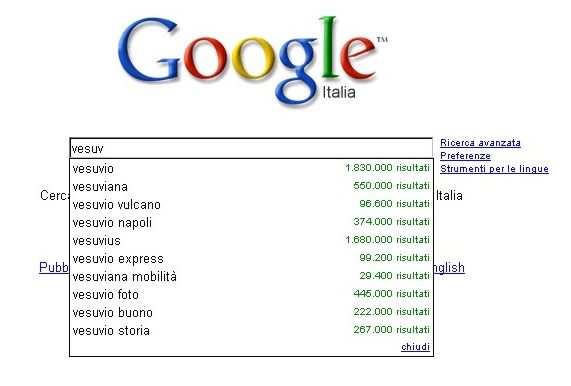 Immagine 2 - Digitando invece vesuv appaiono diversi milioni in pił di link siti sul Vesuvio, vedi immagine 2 qui sotto: